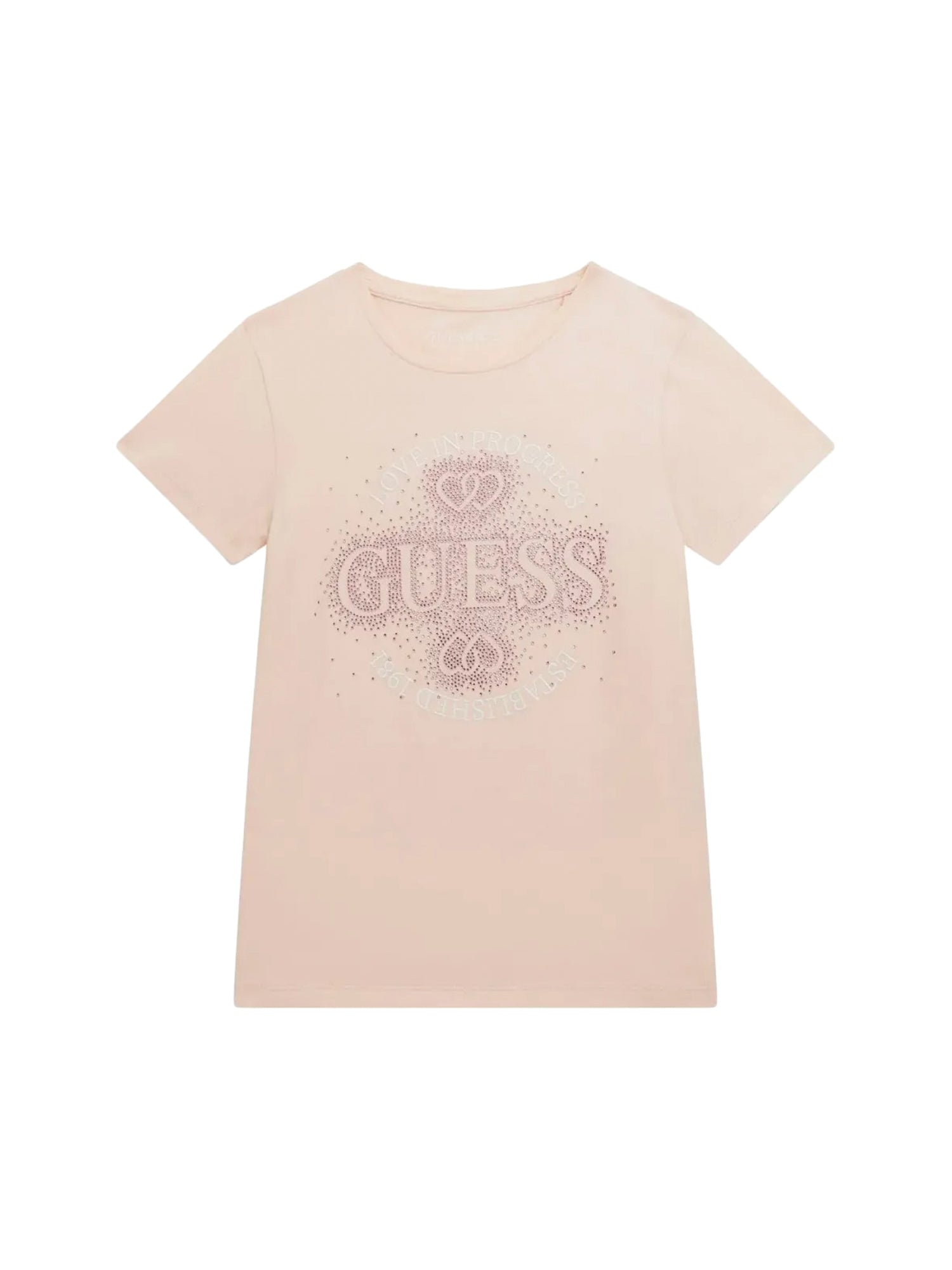 - Logo "GUESS" con strass luminosi, accompagnato dal motto "LOVE IN PROGRESS"