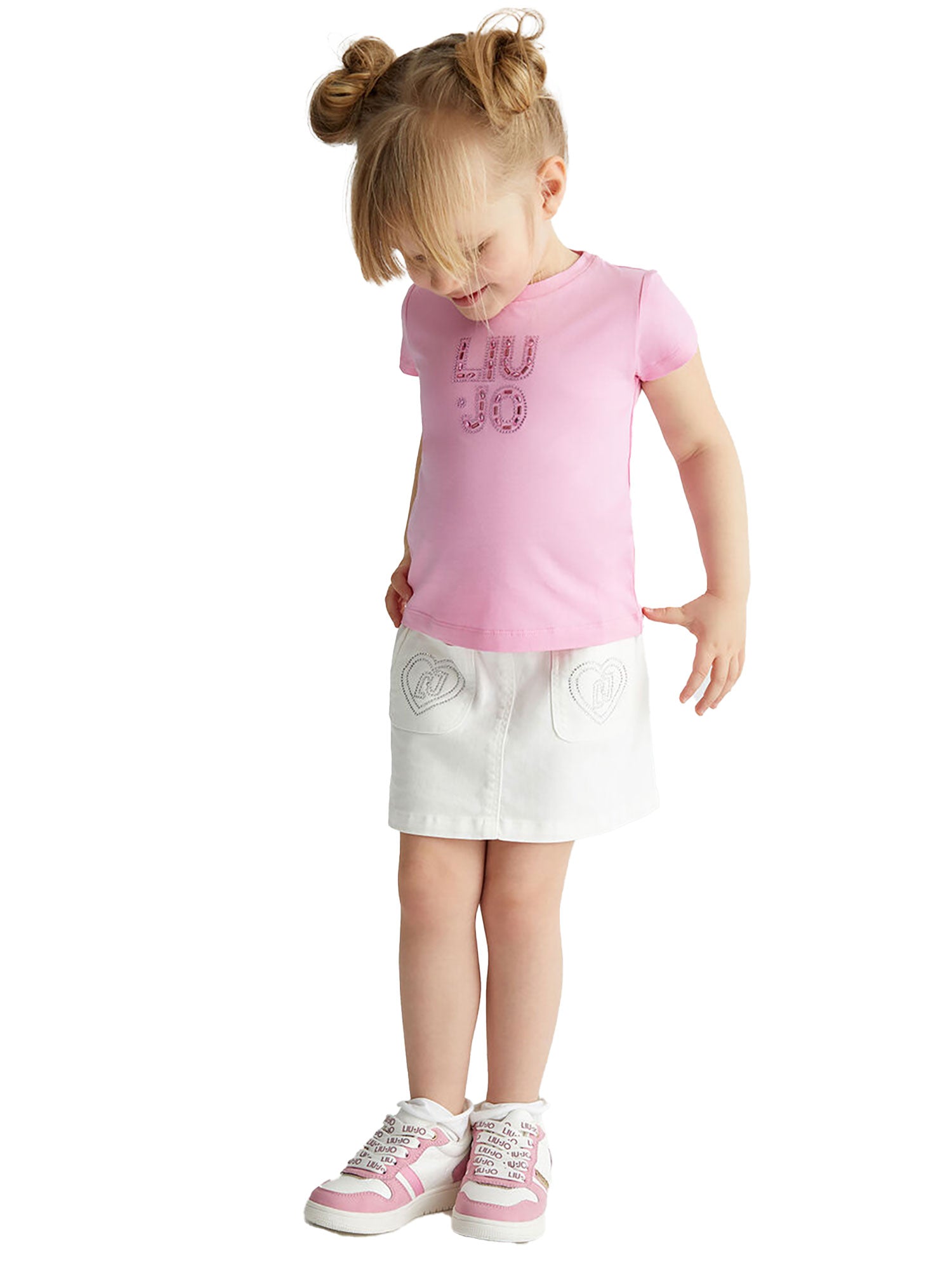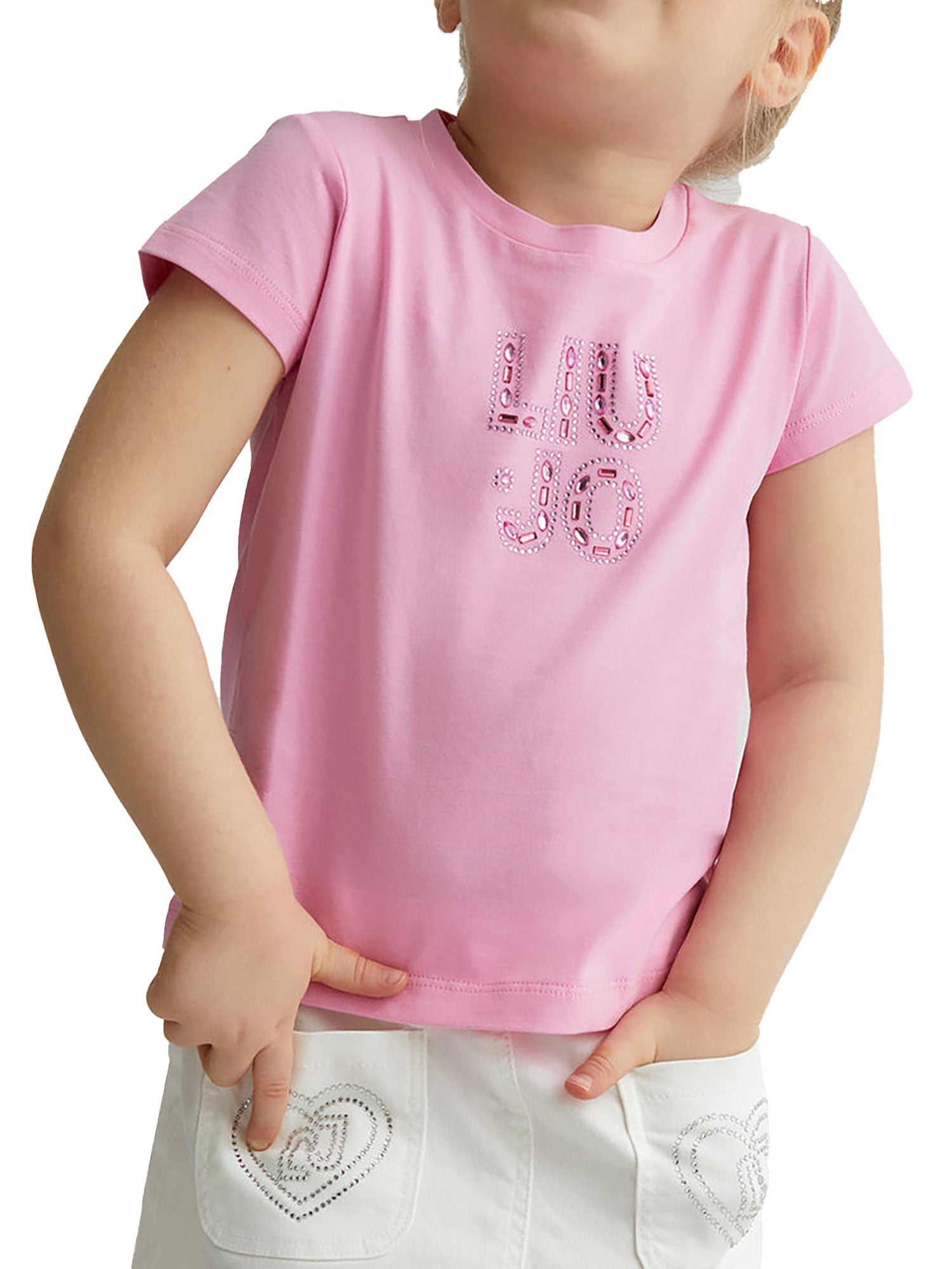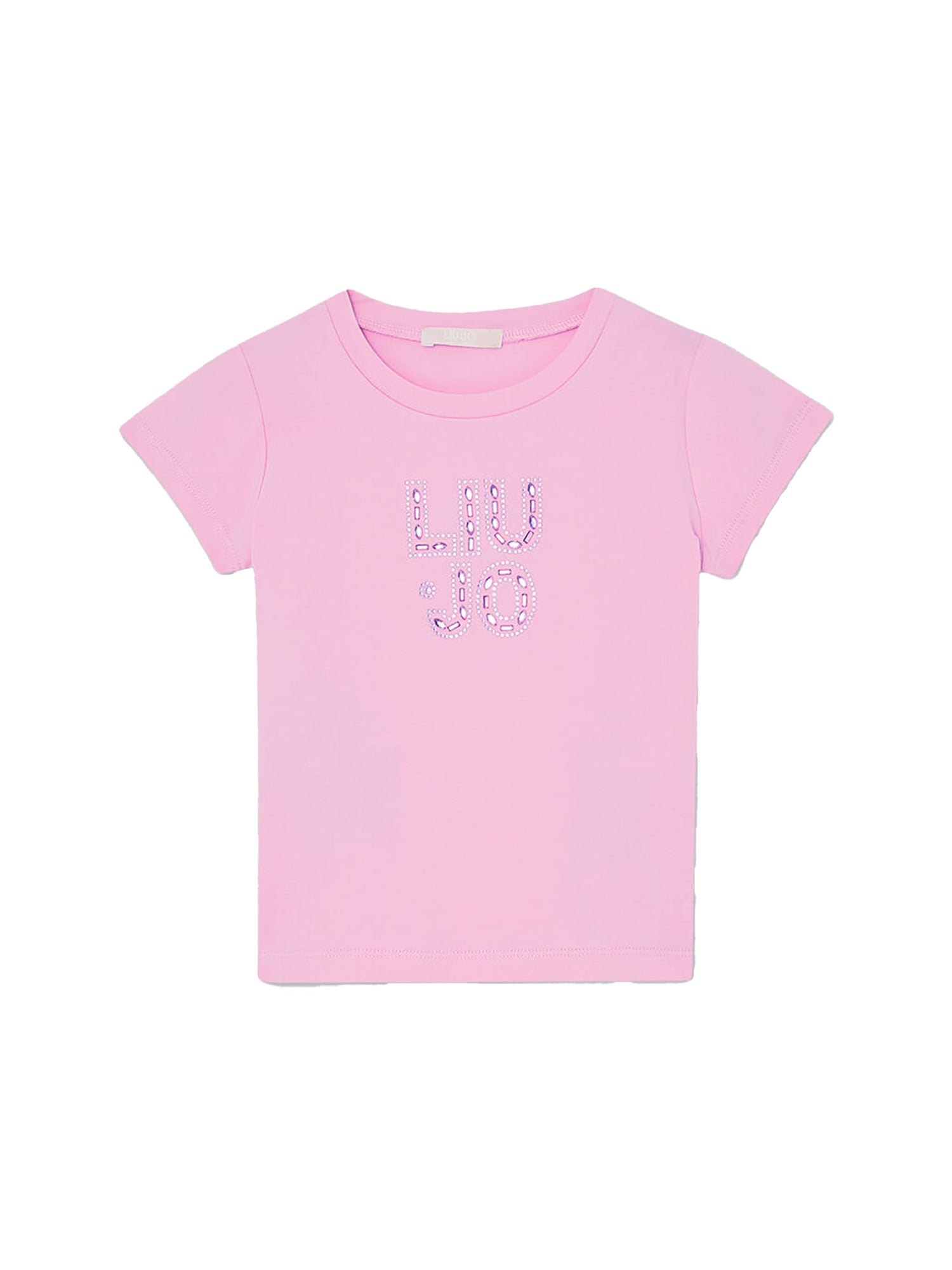T-shirt bimba Liu Jo, modello a manica corta, con logo in strass. Abbinala a jeans skinny e sneakers per un look casual e moderno.