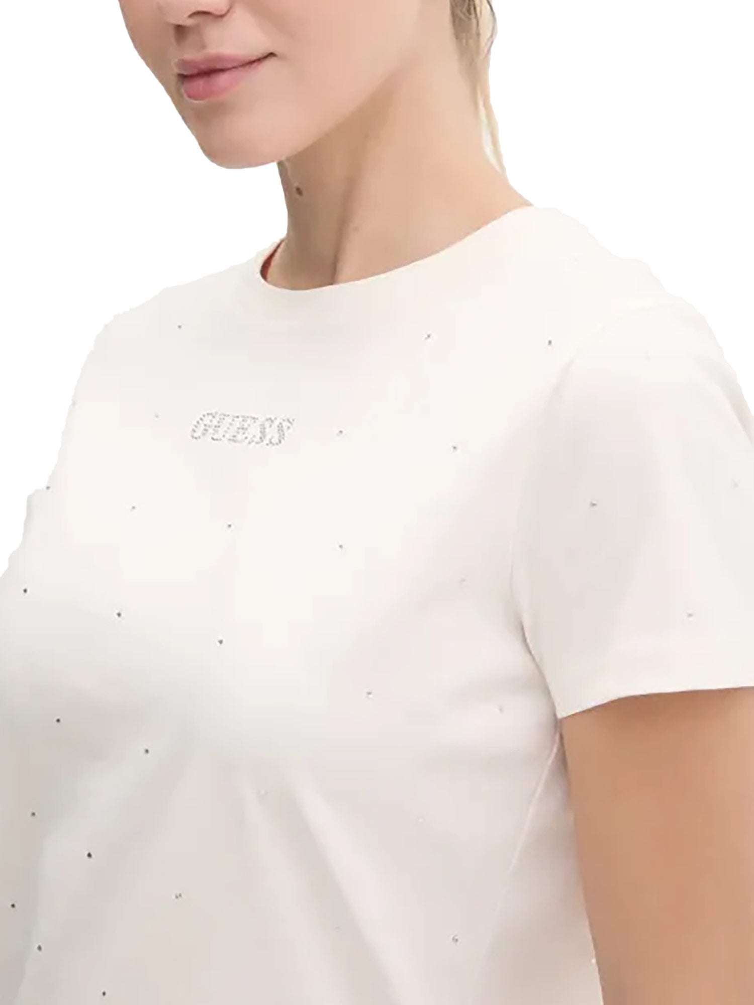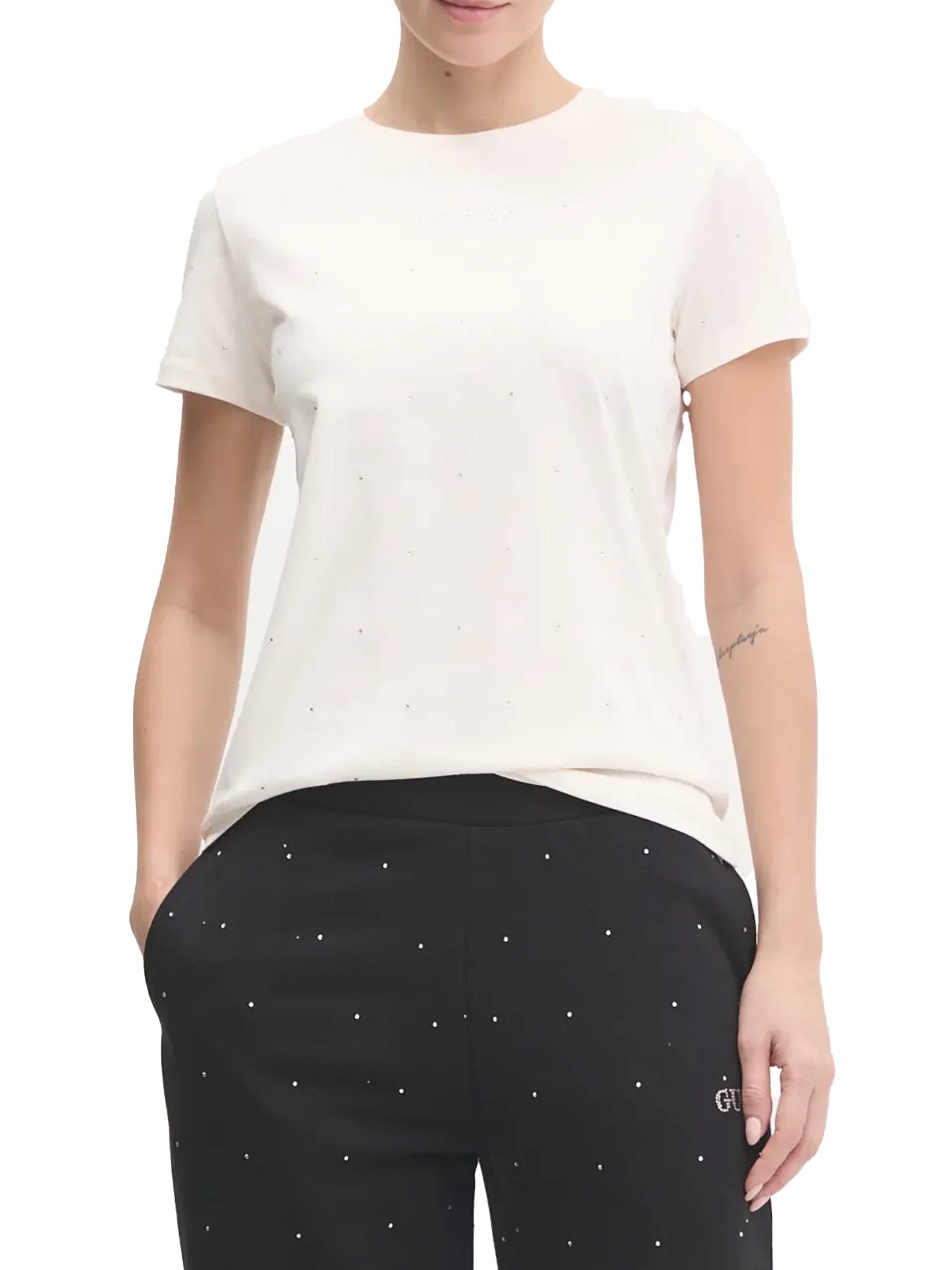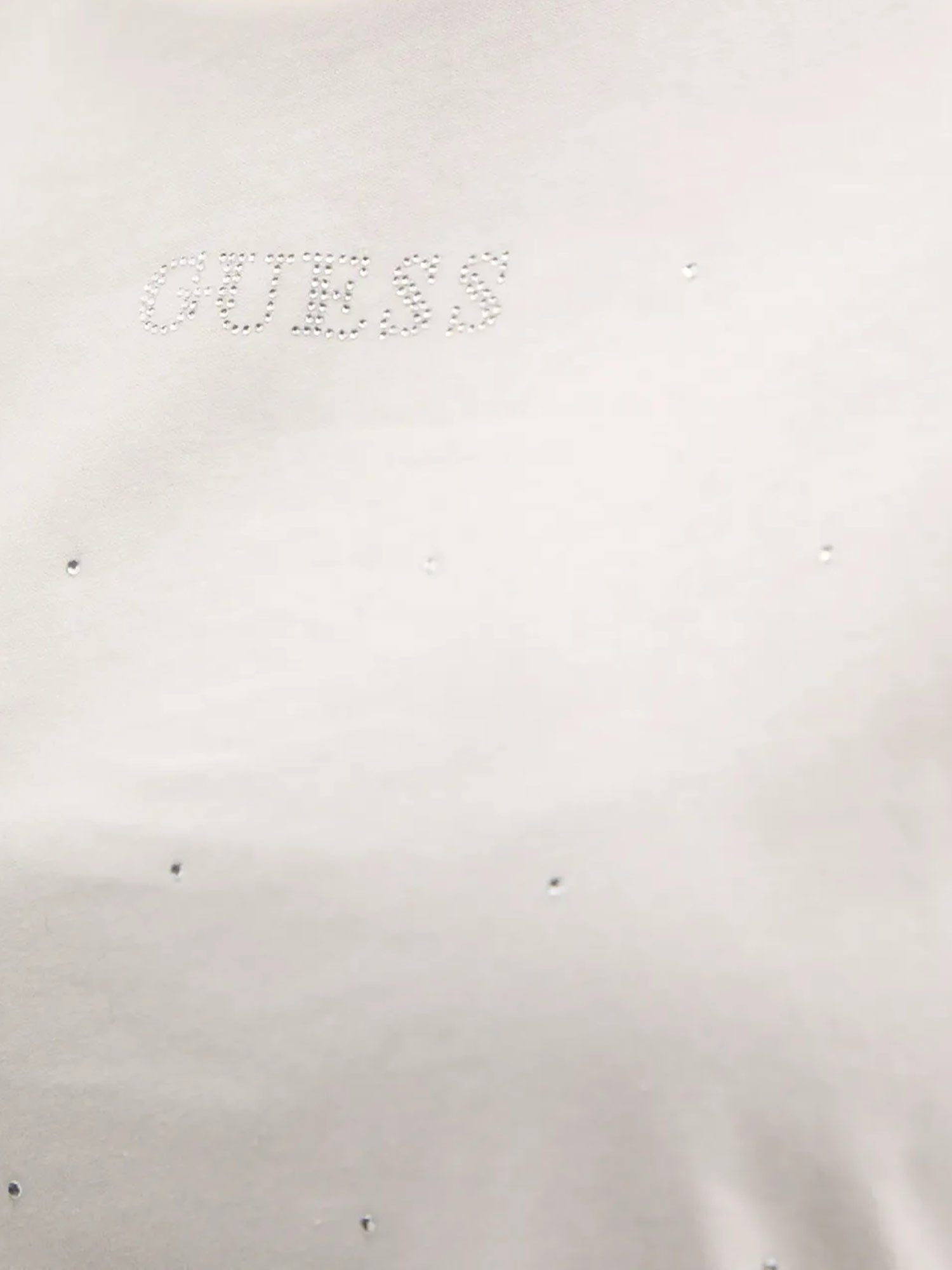 T-shirt Guess a maniche corte con applicazioni strass. Un modello essenziale rivisitato in chiave glam, perfetto per aggiungere un tocco luminoso ai look quotidiani. Il tessuto in cotone misto poliestere la rende confortevole e traspirante, mentre gli strass all-over e il logo frontale impreziosiscono il capo.