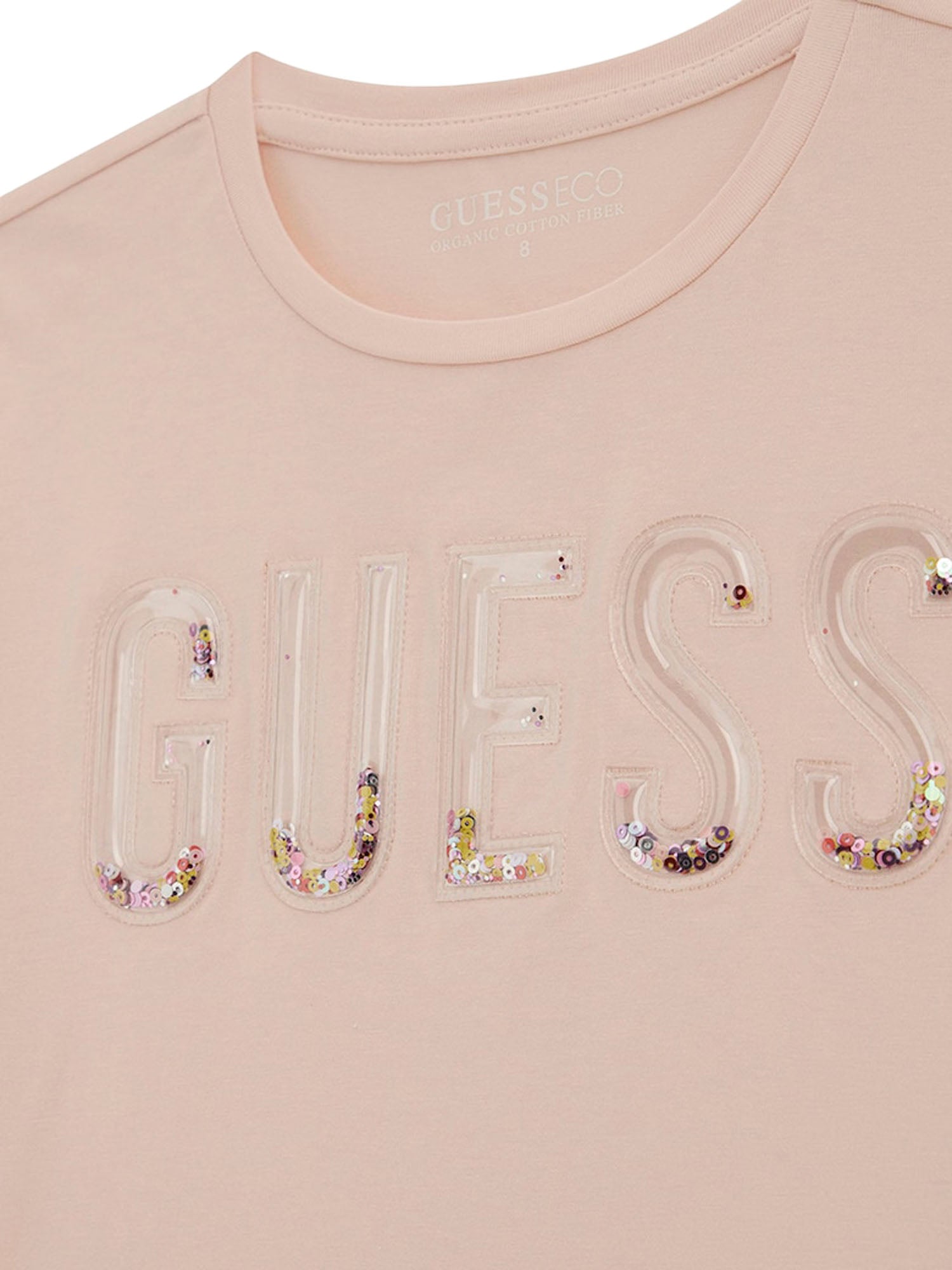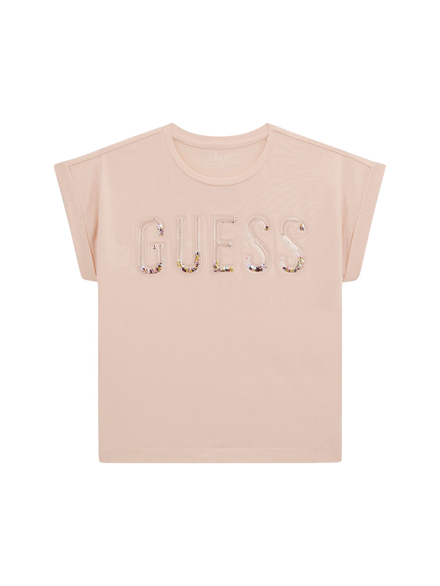 Aggiungi un tocco di stile alla giornata della tua bambina con questa t-shirt Guess in cotone organico. La scritta "GUESS" in lettere trasparenti, riempite di paillettes colorate, cattura la luce con un effetto brillante e divertente. La maglia presenta un taglio ampio e moderno con maniche corte e larghe, ideale per un look casual e comodo. Perfetta per le giornate più calde o per un'uscita speciale, questa t-shirt è un must-have nel guardaroba dei più piccoli.