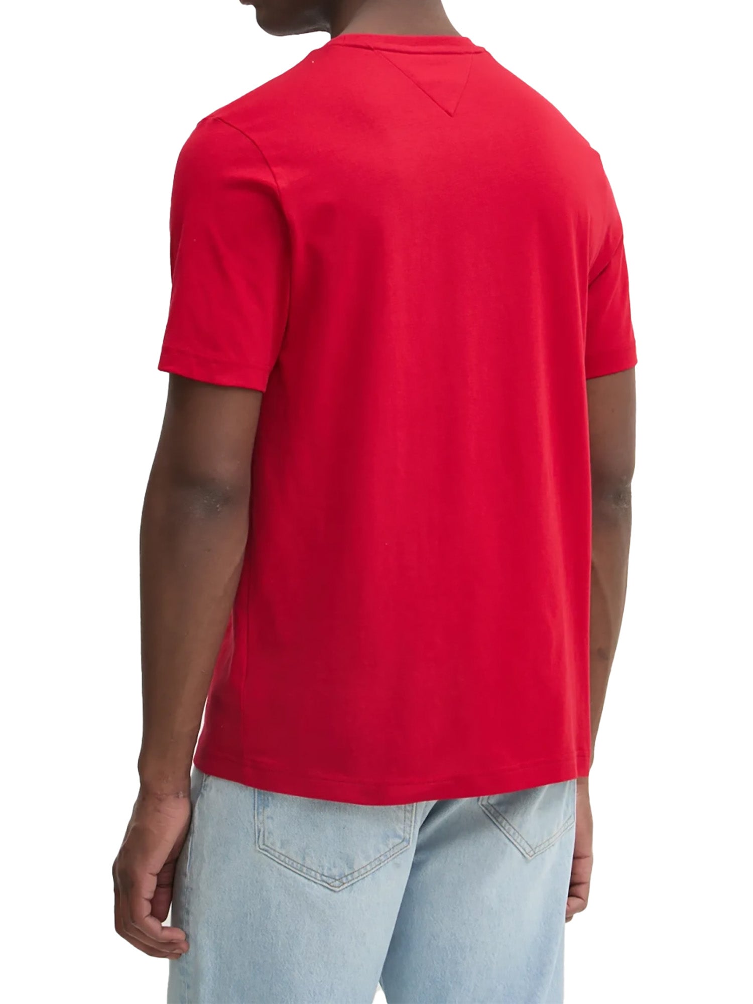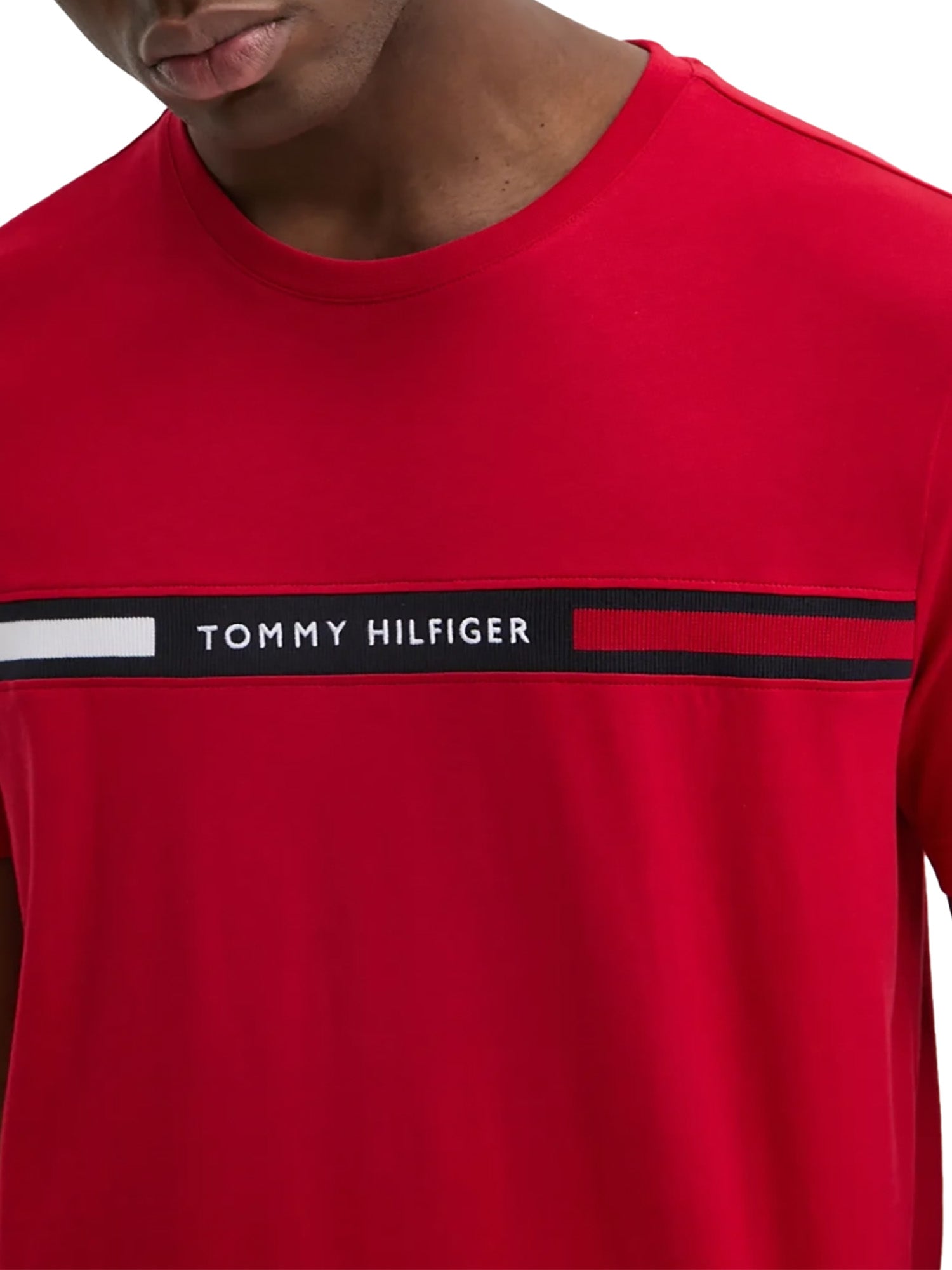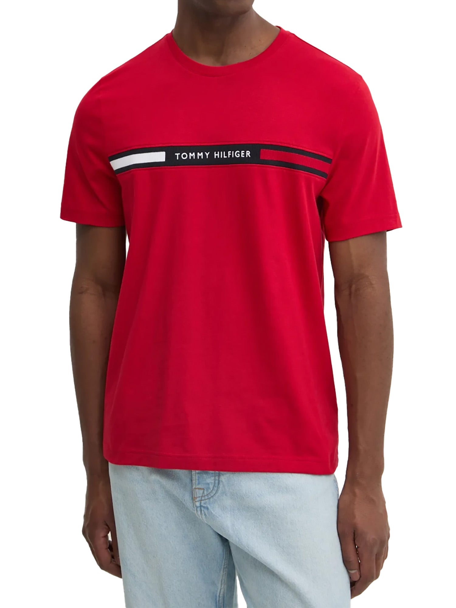 Classica T-shirt a girocollo firmata Tommy Hilfigher che si distingue per l'originale inserto con nastro iconico aggiungendo una nota di vivacità.