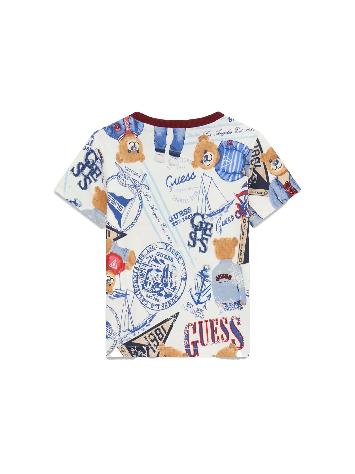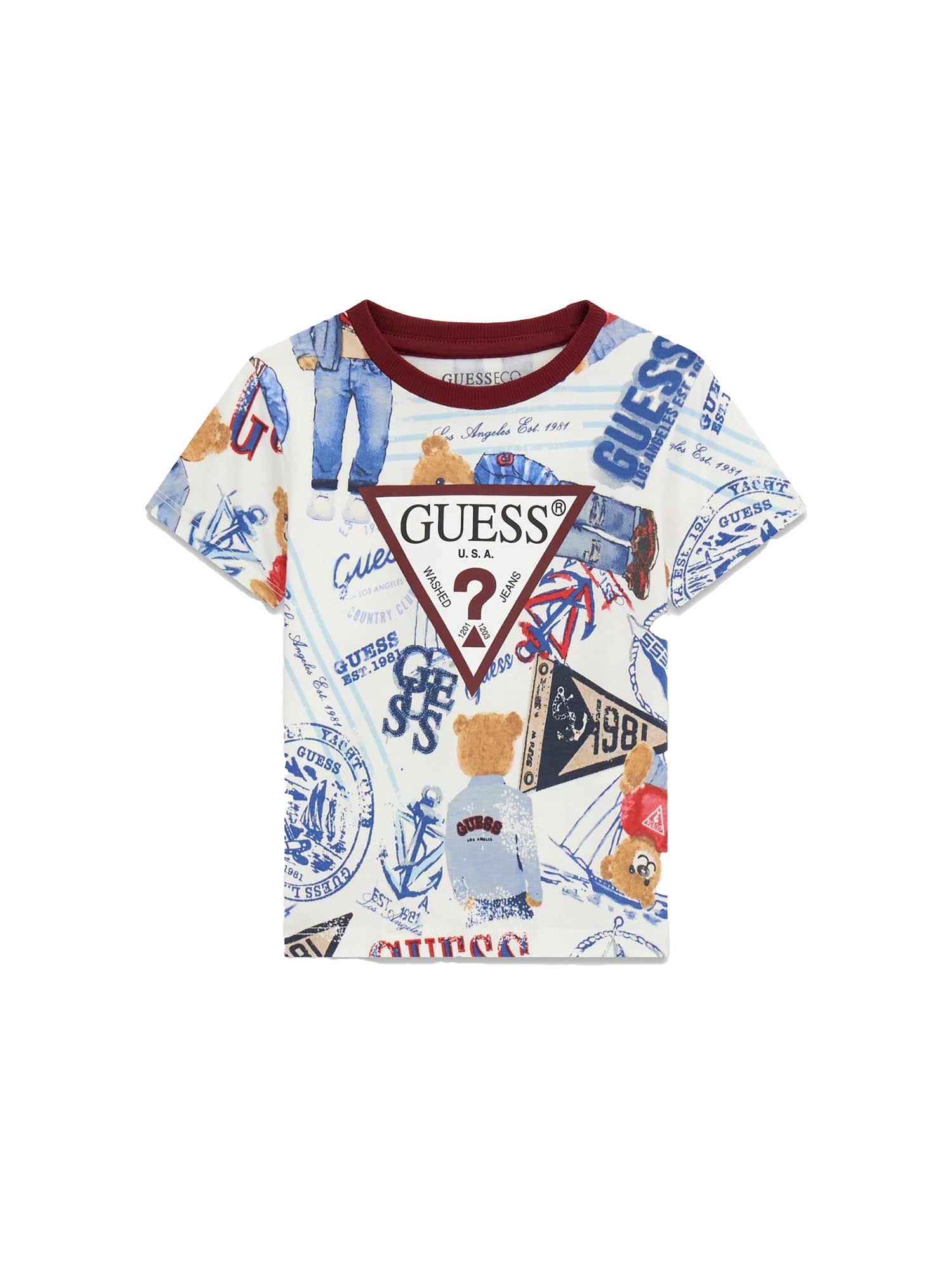 T-shirt Guess neonato stampa all-over con logo iconico. Un capo vivace e ricco di dettagli, perfetto per un look trendy e pieno di energia.