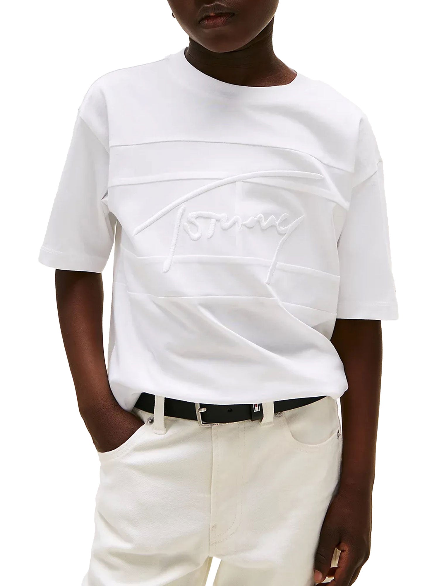 T-shirt a manica corta Tommy Hilfiger da bambino dal design pulito ed elegante, valorizzata dal logo Script ricamato tono su tono sul petto, perfetta per look quotidiani curati e versatili.