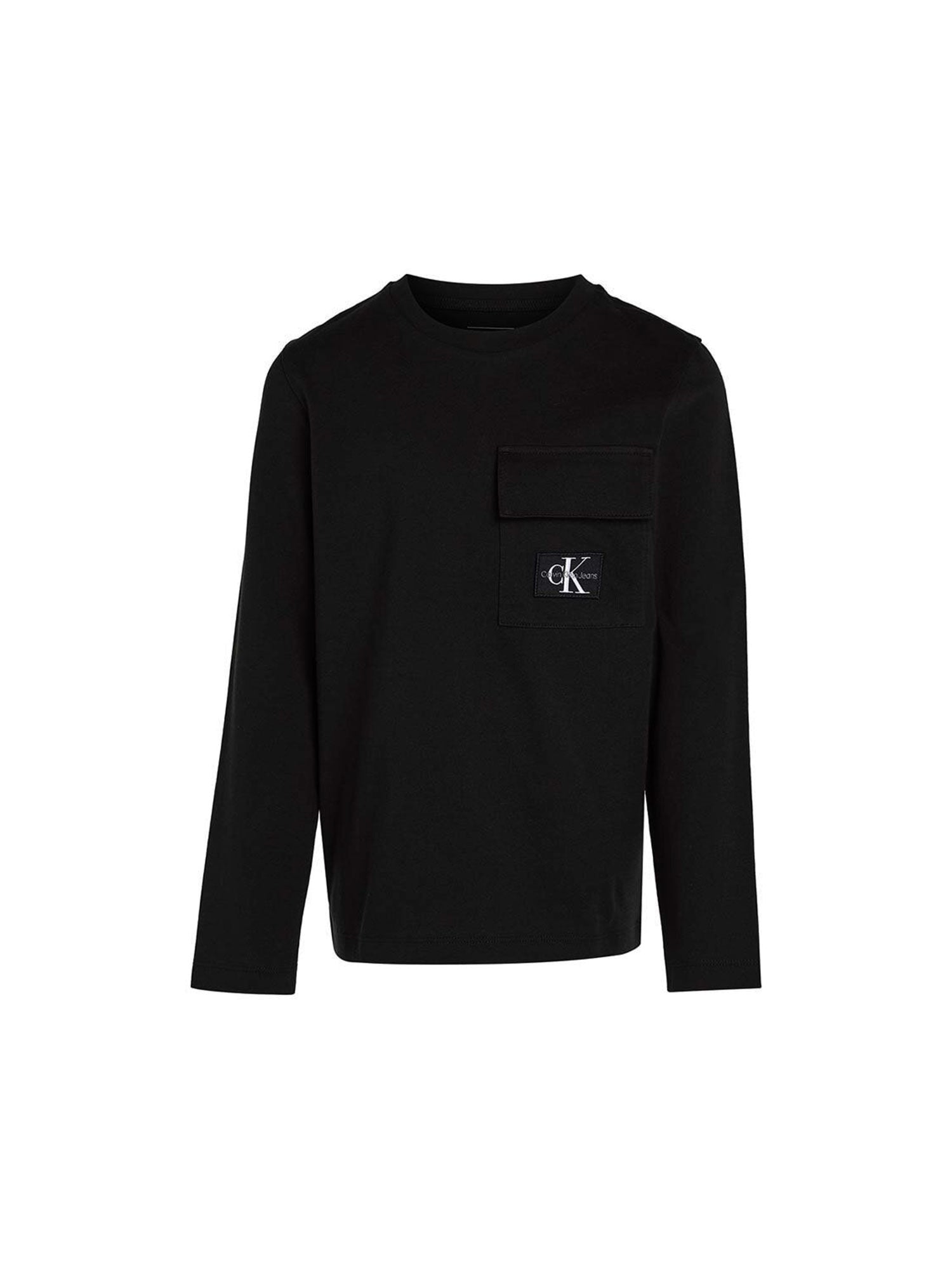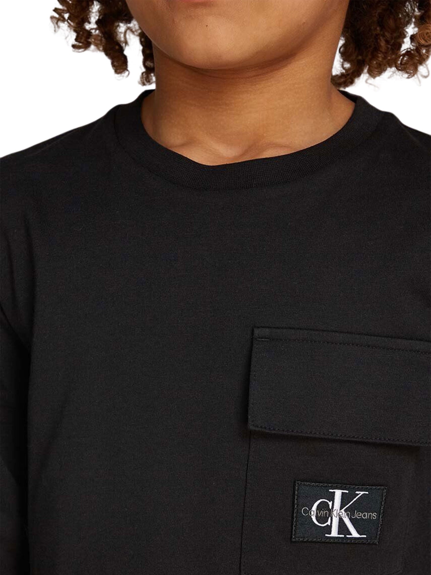 T-shirt bambino Calvin Klein a maniche lunghe in cotone nero, caratterizzata da una tasca frontale applicata con patta, impreziosita dal logo "cK Calvin Klein Jeans". Il design unisce praticità e stile minimal, perfetto per chi cerca un capo versatile e moderno per completare il proprio guardaroba casual.