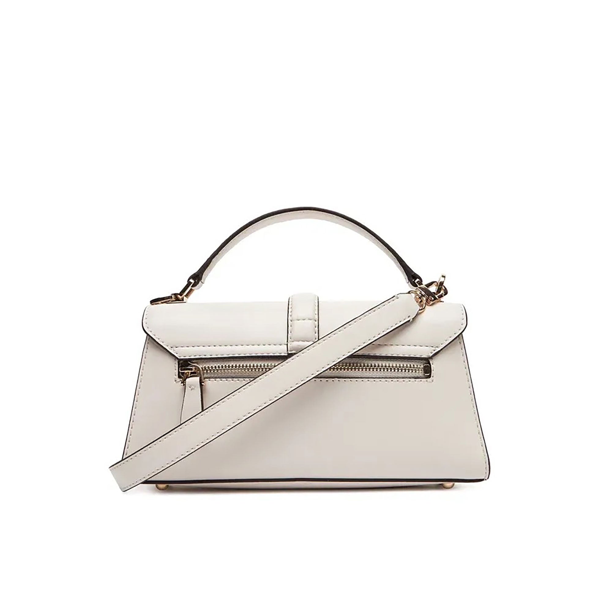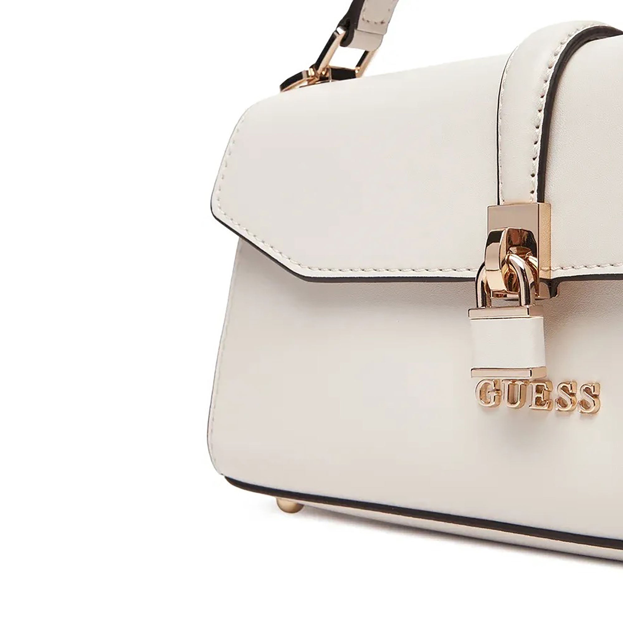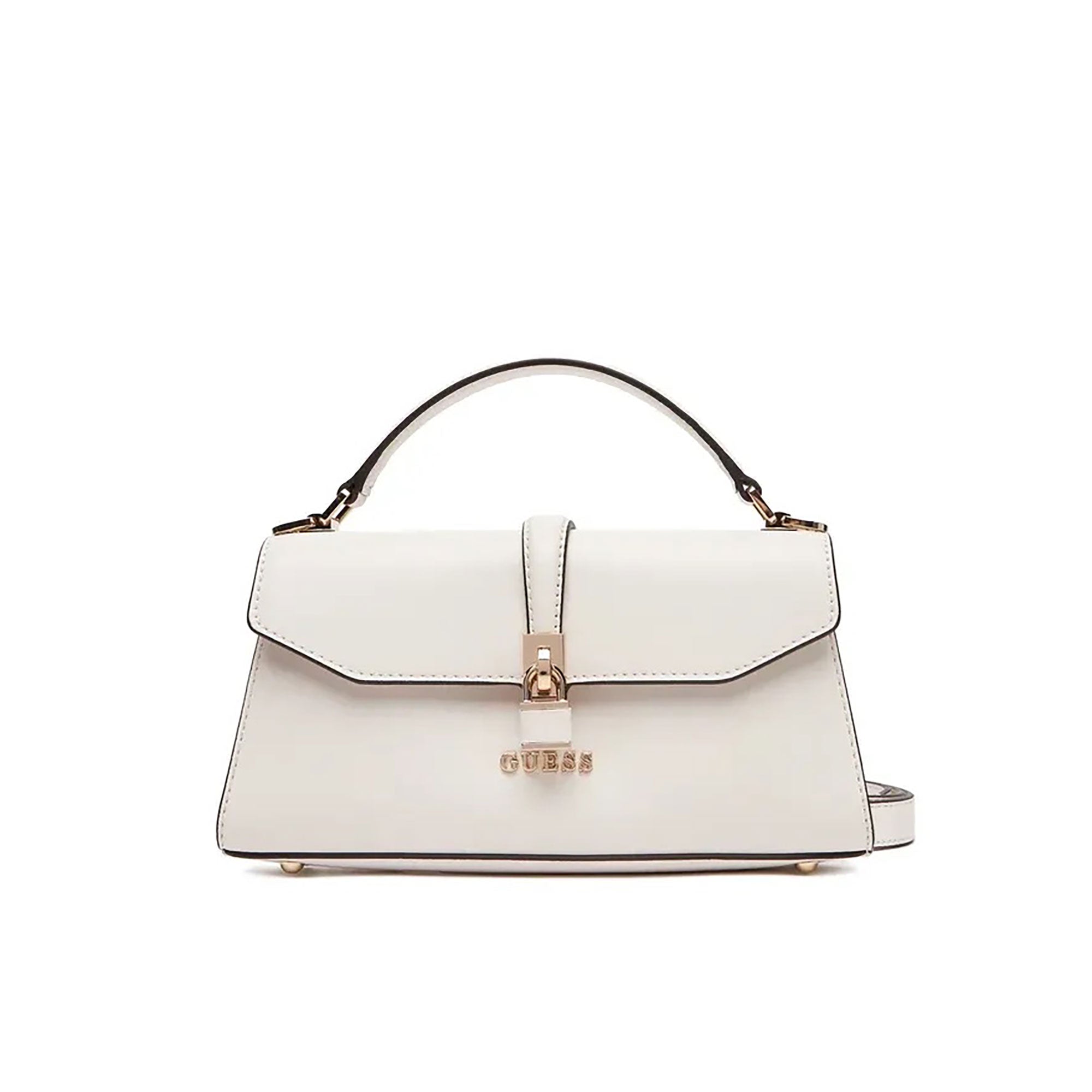 Borsa Guess da donna modello Queensland in similpelle liscia dal design strutturato. Il modello presenta un manico rigido e una tracolla regolabile, arricchito da dettagli metallici oro e da una chiusura con iconico lucchetto frontale. Interno organizzato con tasche e tasca esterna con zip.