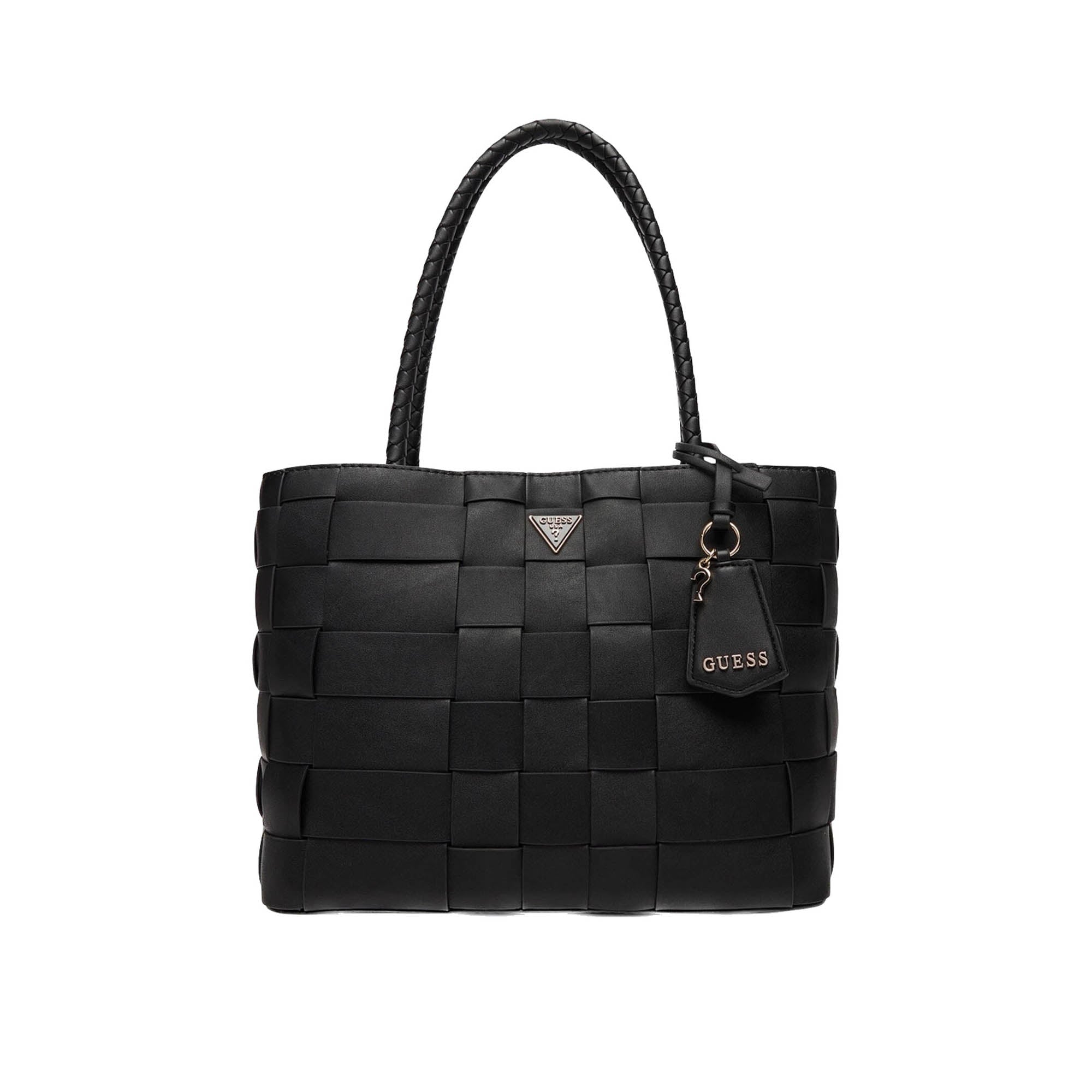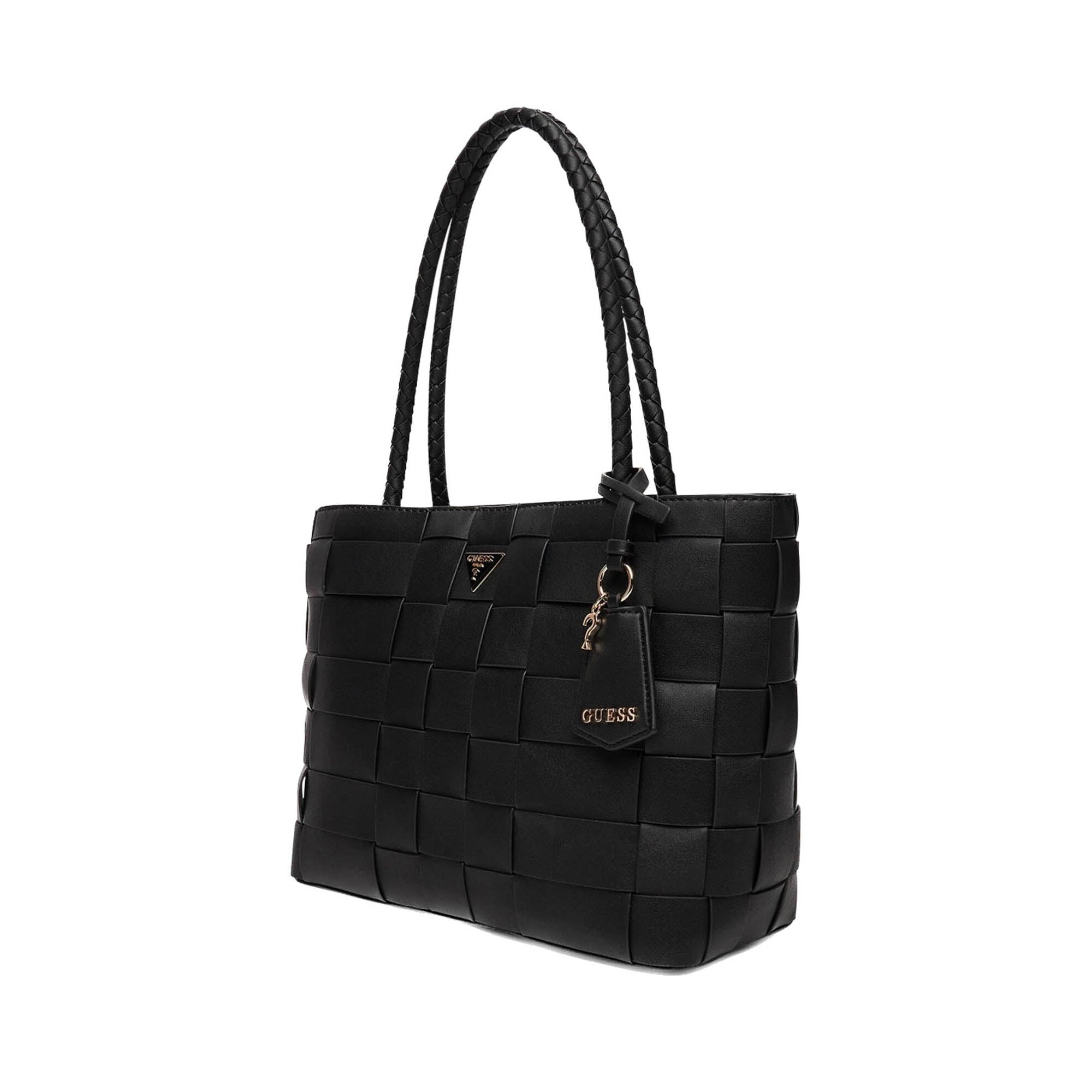 Borsa Guess donna in similpelle intrecciata, caratterizzata da un design moderno e raffinato. I manici intrecciati aggiungono un tocco elegante, mentre il charm logato completa il look con un dettaglio distintivo.