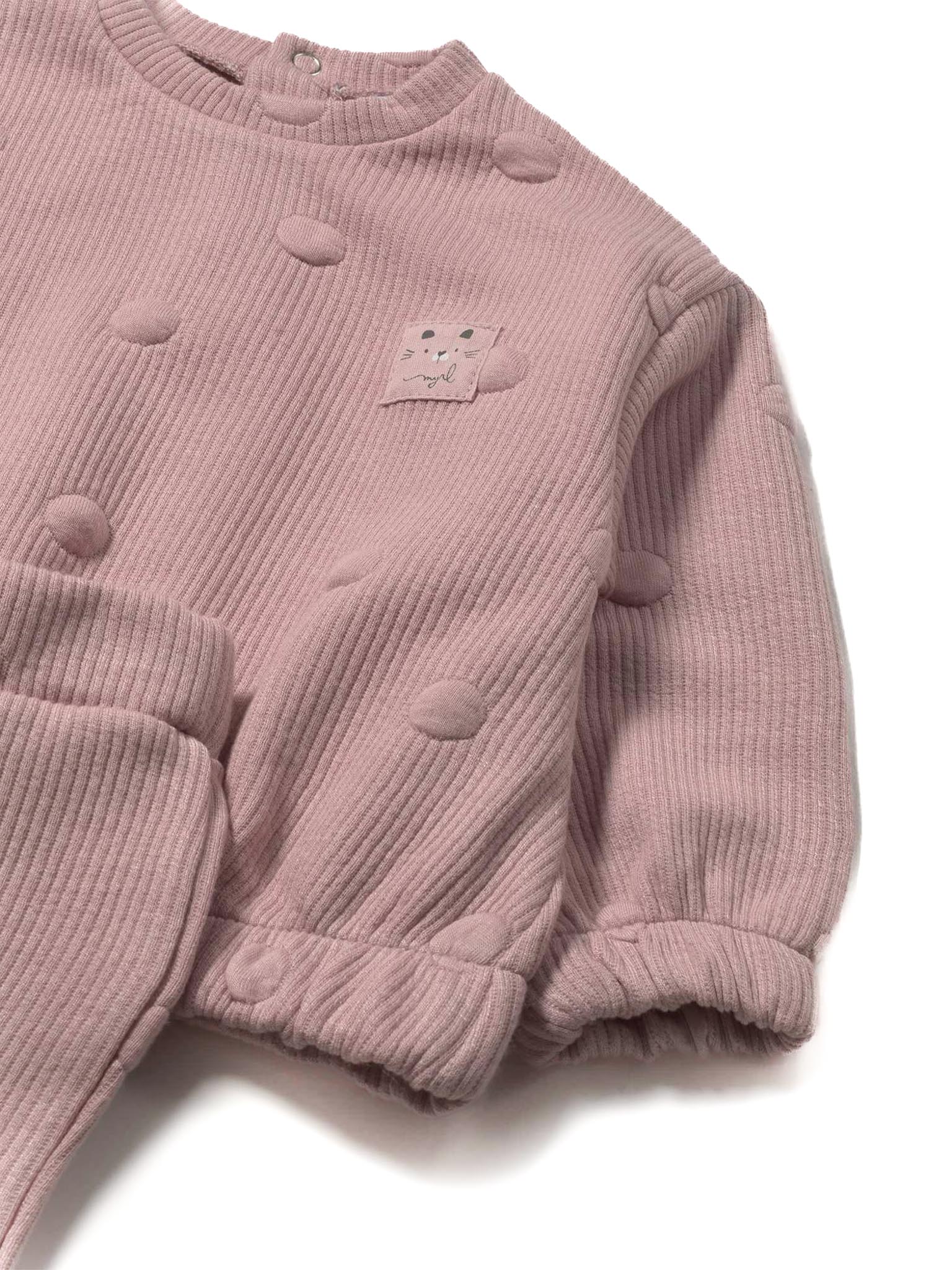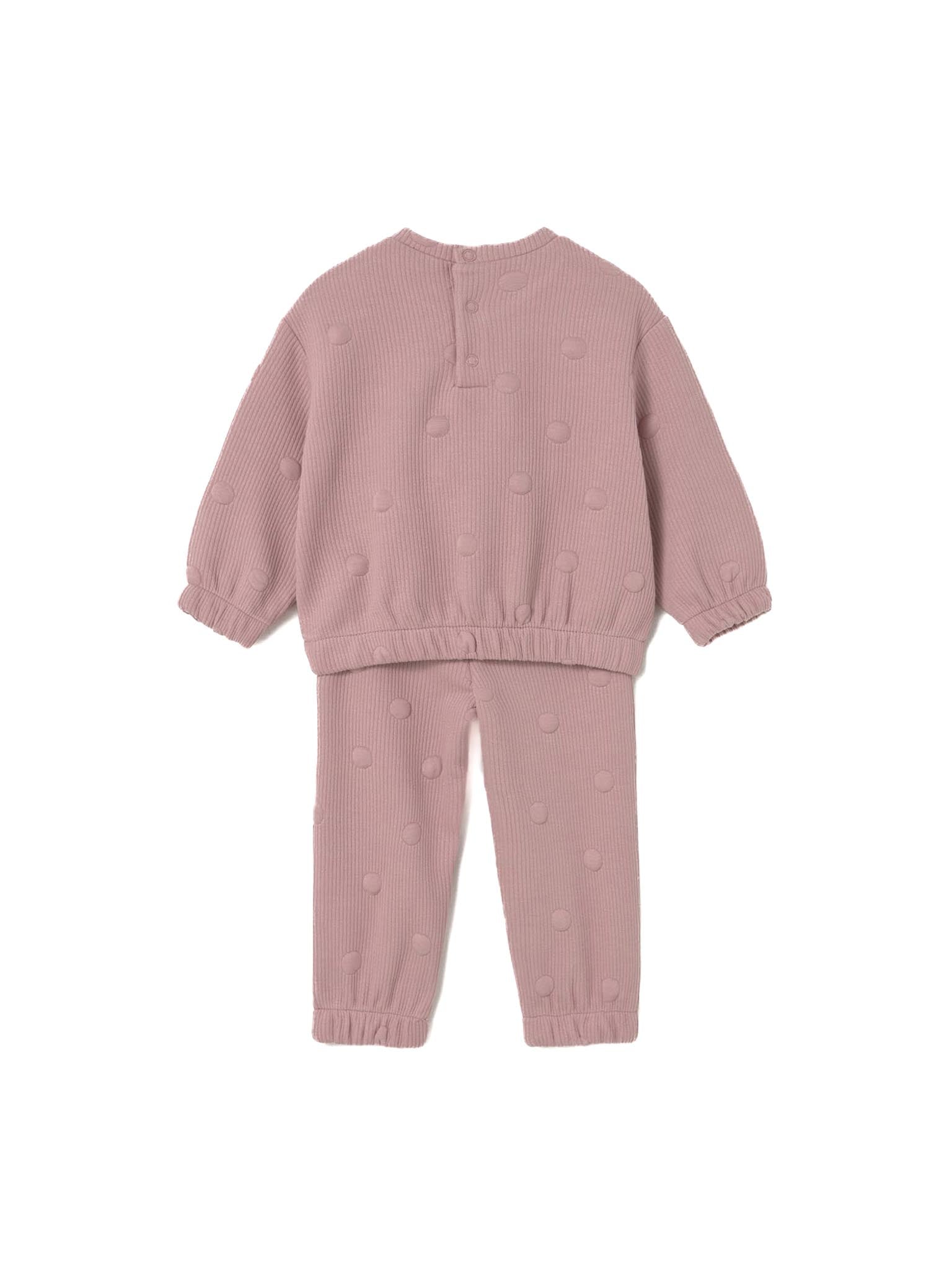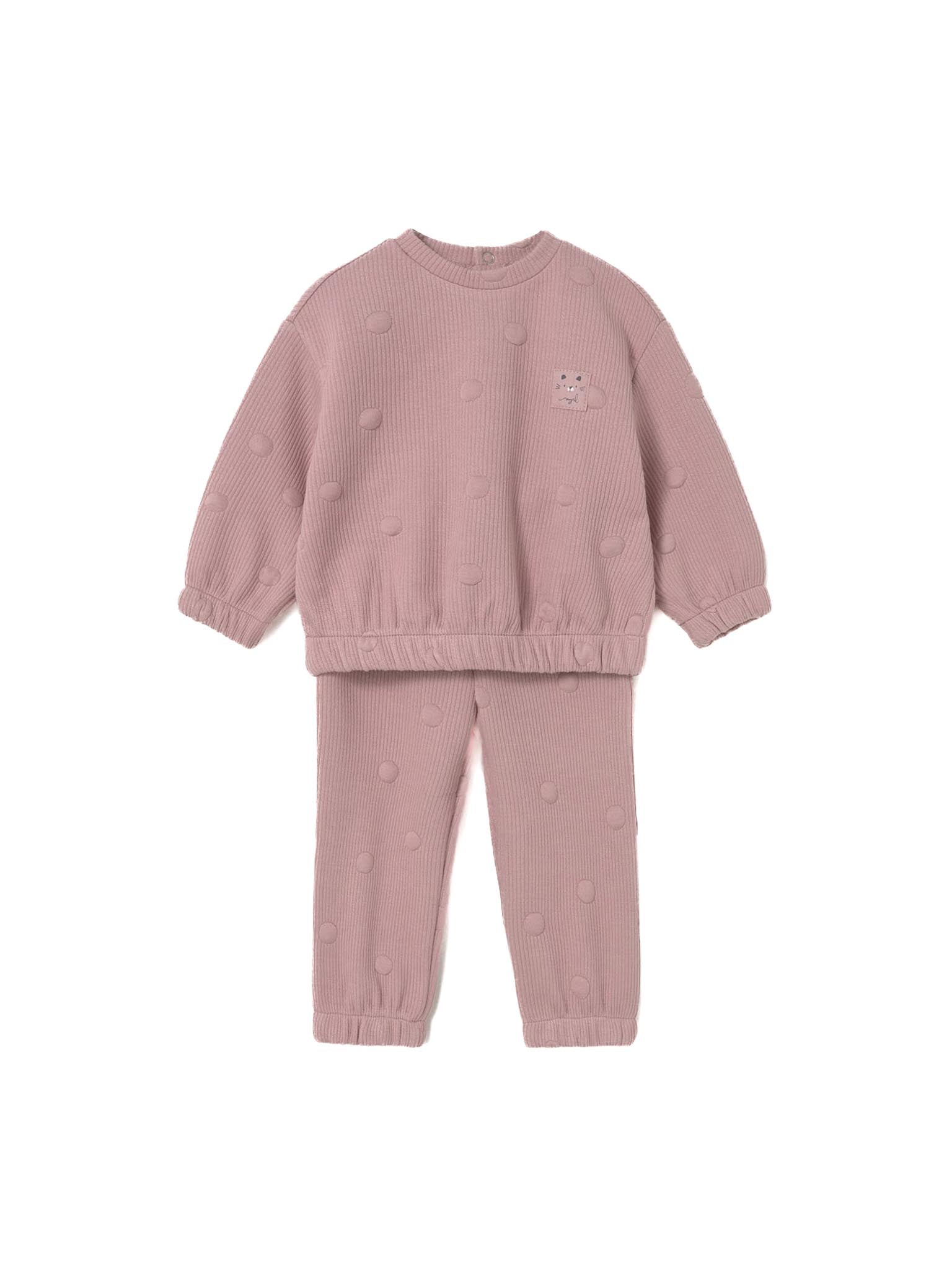 Questo completo coordinato è ideale per il comfort quotidiano e lo stile della tua bambina. Il tessuto morbido e confortevole, combinato con il design a pois, lo rende un capo perfetto per ogni occasione informale. Il pantalone e la felpa con polsini elasticizzati offrono una vestibilità pratica e comoda.